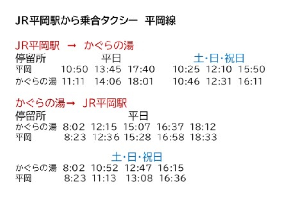 遠山郷地域では、公共の交通機関が限られるためご移動の際は事前にタクシーのご予約もご検討ください。