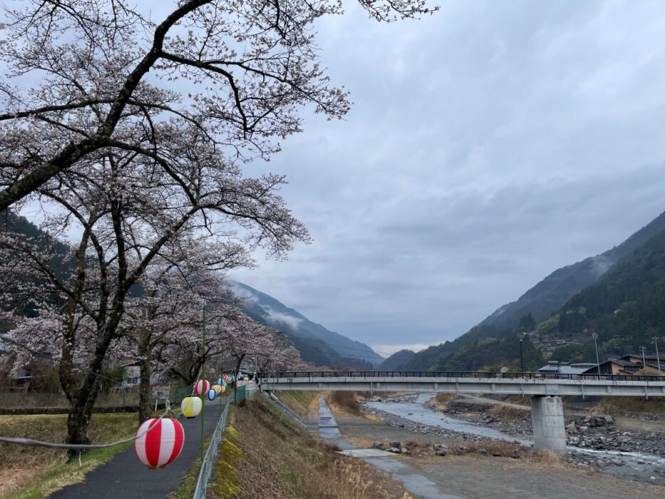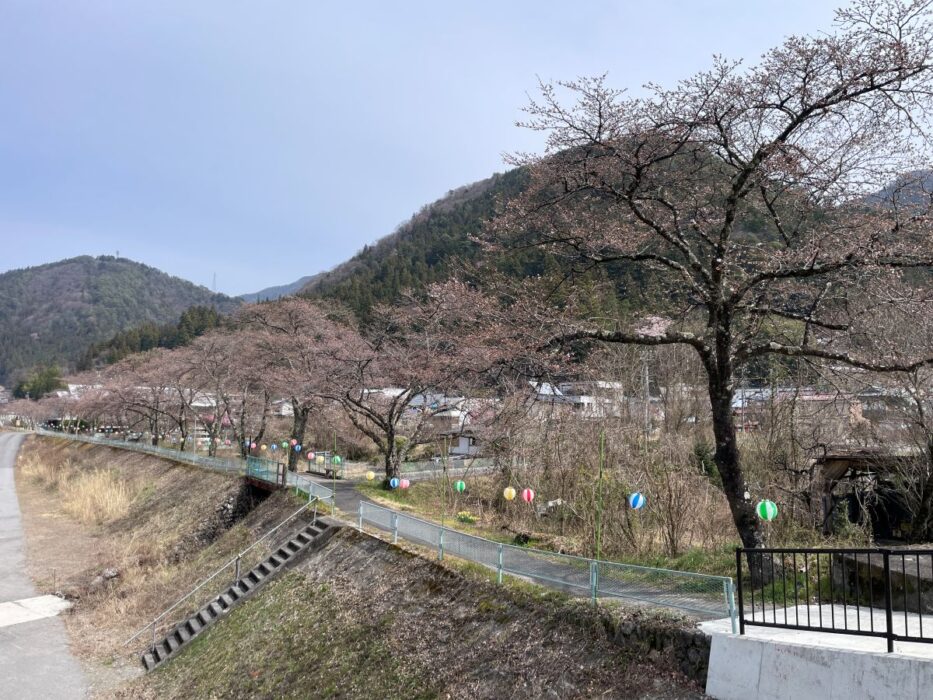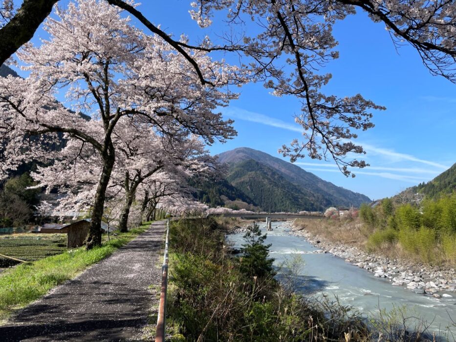 「道の駅遠山郷」近くの遠山川左岸に、約1kmの距離に約60~70本が植樹され桜並木となっています。