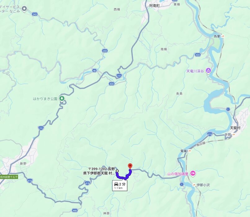 規制区間(座標値):天龍村神原足瀬バス停(35.2595,137.7984) ~ 天龍村神原戸口(35.2598,137.8045)